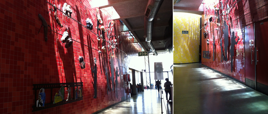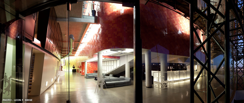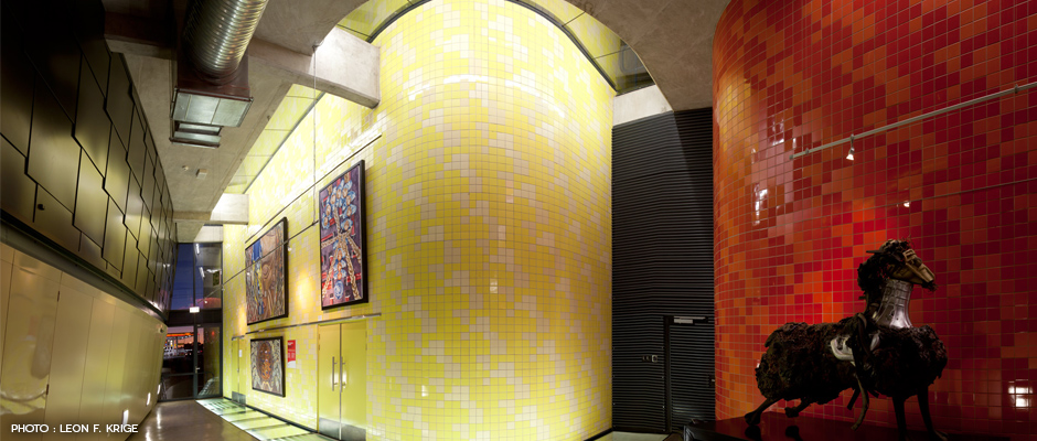 The bejewelled boxes surrounded by light fissures, and the steel- work of the facade, designed like events- rigging. The tile coating shimmering from the fissures, the light-trough further adding to the preciousness of the magic that awaits one within. The boxes are illuminated day and night through these fissures.