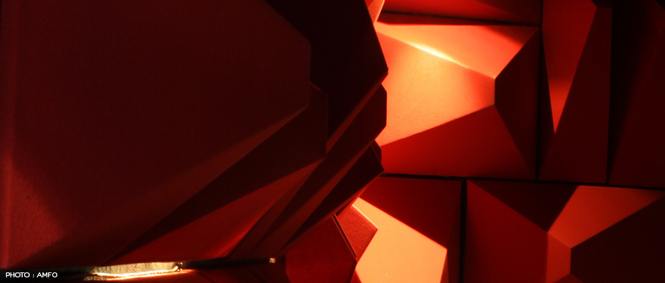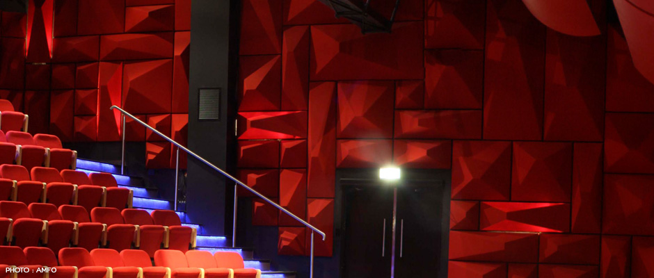The acoustic treatment of various sized pyra- mids arose out of the designer’s fascination with “Casa dos Bicos” in Lisbon.