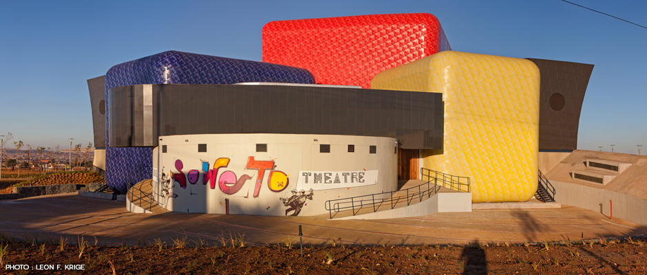 The “back” of the Soweto theatre becomes a front to the street corner; a graffiti wall for the local artists and a black wall for long banners to advertise events. The coloured boxes advertise themselves.